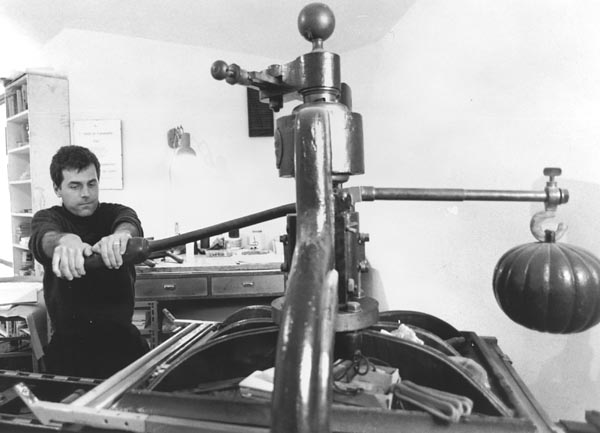 The press was made by Steve Pratt. As recorded on the finial, it is the 15th Albion to emerge from his press works, completed in the late summer of 2007. It's a beautiful piece of casting & machining, and deserved to have been put to work immediately. Alan Dye, at Nimble Impressions, received Pratt Albion Number 18 in 2011, and was much quicker off the mark to put it to work. He also took better pictures of its arrival & use; see here.
