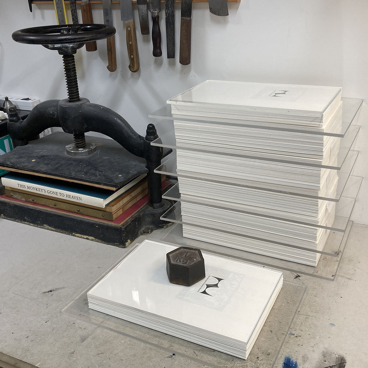 Believe it or not, I’m still collating copies of This Monkey’s Gone to Heaven. That’s the entire edition of 40 copies below, the printed sheets trimmed, collated and waiting for the sample leaves to be inserted before sewing. That bit takes ages because each of the sample leaves has to be inserted in a particular way. But I have the cases all figured out, so it’s just a matter of pushing through. Still on track for publication in April.